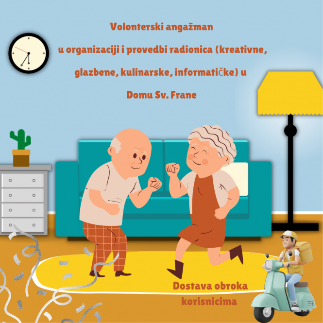 | Dostava obroka korisnicima koji nisu baš u formi za hodanje do Doma i Organizacija i vođenje radionica – od kreativnih, glazbenih, kulinarskih pa do informatičkih! |